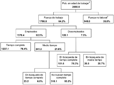 El siguiente diagrama muestra la estructura de la fuerza laboral de un país de la “población en edad de trabajar”. La población total del país en 1995 fue cerca de 3.4 millones.